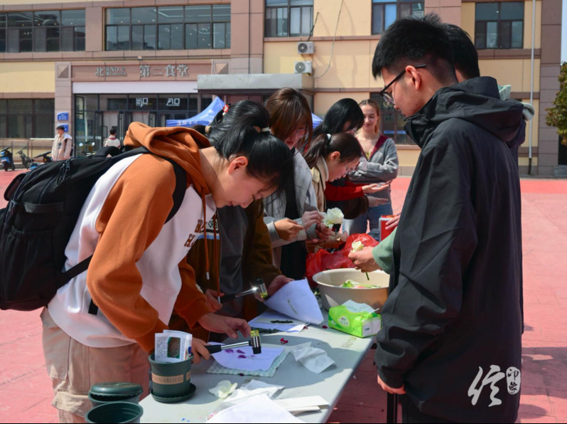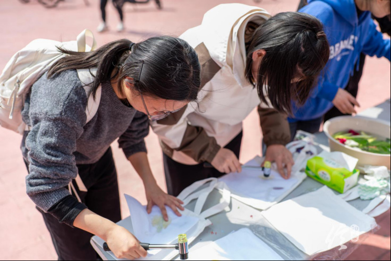 活动现场,同学们纷纷驻足,亲手将春日的色彩定格。大家首先挑选出形态各异、汁液饱满的叶片与花瓣,将其精心布局在洁白的棉布上,并用胶布牢固封存。随后,伴随有节奏的“咚咚”声,大家用小锤耐心地敲击,让植物的脉络与色素缓缓渗透进布料的纤维之中。当小心翼翼地揭下胶布与植物残片时,一幅幅脉络清晰、色彩自然的拓印作品便惊艳亮相。