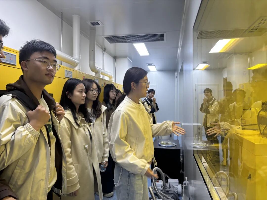 在信息北楼的电子工程实验室,大家近距离观看了磁控溅射仪、离子刻蚀机、EBL电子束光刻系统等微纳加工设备的工作环境。老师和研究生学长学姐结合实物,耐心细致地讲解了相关设备的系统构成、核心技术、工作原理及典型应用场景。通过现场演示和同学们的实际体验,抽象的技术理论变得具象可感,帮大家快速建立对专业超净间的直观认知,近距离接触科研实践,感受真实的科研氛围。